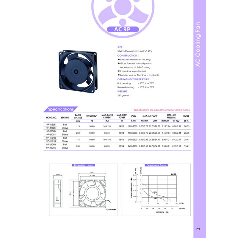 • 原裝臺灣百瑞工業(yè)散熱風扇AC 9P115HB 92*92*25MM加熱器散熱風扇